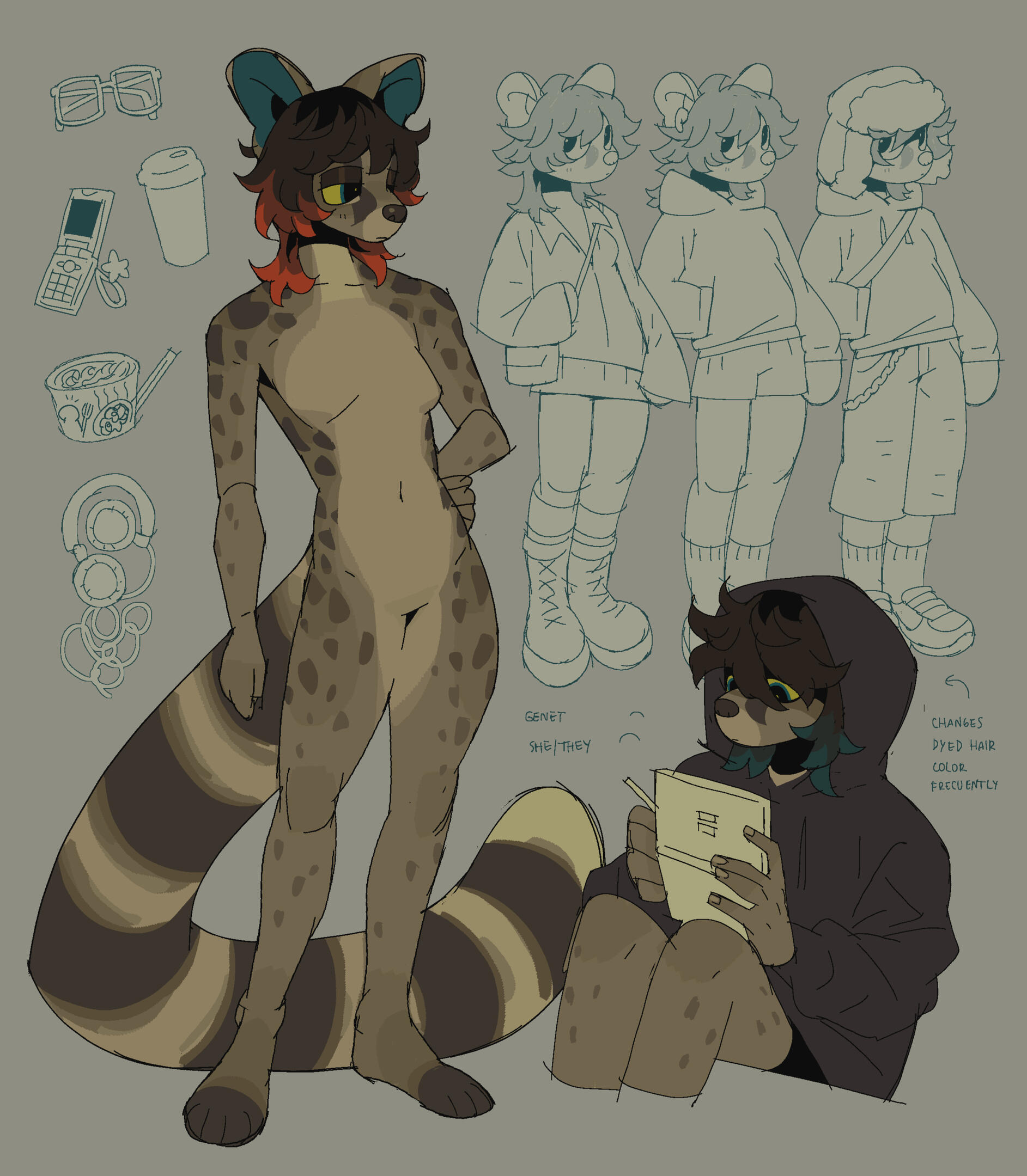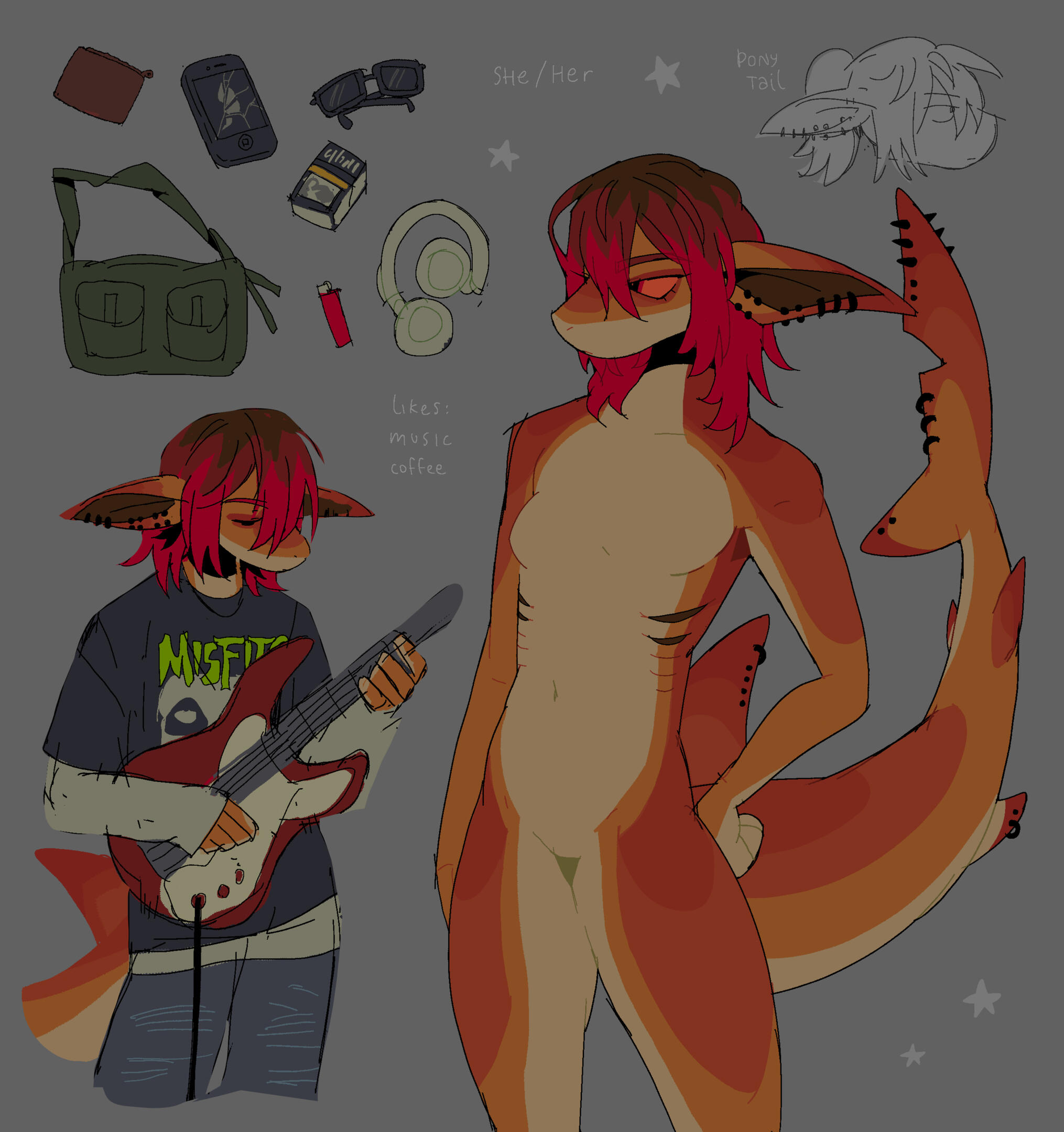 each item from the inventory, eyes close up, genitalia close up)